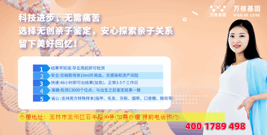 主要服务于:玉州区、福绵区、容县、陆川县、博白县、兴业县、北流市等玉林周边城市,可咨范围:司法亲子鉴定、胎儿dna亲子鉴定、个人亲子鉴定、移民亲子鉴定、入户亲子鉴定、中考报告亲子鉴定、高考亲子鉴定等。